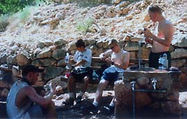 The canyon hike. Pictured are Jeff, Peter, Brian and Mike. The guys are taking a break at an area called Indian Gardens. It is about 4 miles from the river and is a nice stopping spot, with running water and restrooms. It is the first of three water stops on the way back out of the canyon.